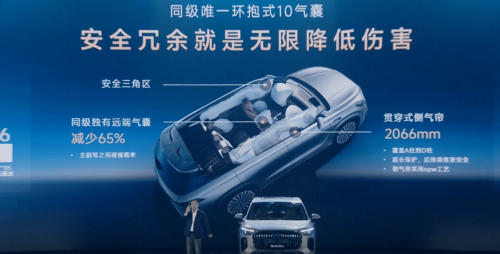 内饰方面,瑞虎9X摒弃了瑞虎9的一体式显示屏,采用悬浮式仪表盘与15.6吋2.5K高清中控屏的组合道正网 ,搭配3D可视化交互HMI,科技氛围更浓厚。 同时瑞虎9X对中控台下方空调出风口及辅助仪表区进行创新性设计,14扬声器的 “伯牙之音” 音响系统,则进一步升级了车内视听享受。安全性上,搭载同级唯一环抱式10气囊,贯穿式侧气帘达2066mm。