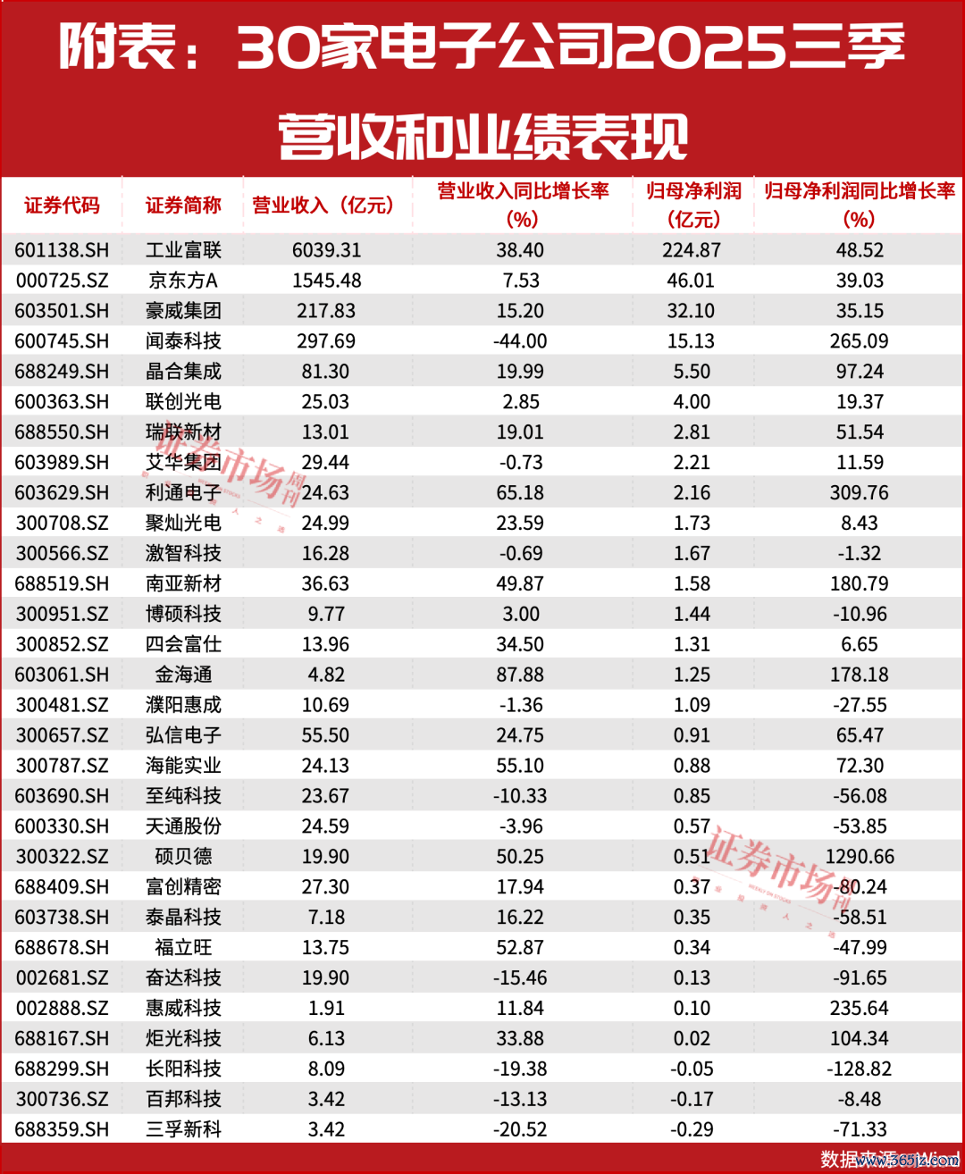 值得一提的是,工业富联、京东方A、豪威集团、闻泰科技等归母净利润超过10亿元甚至200亿元的公司,业绩增速均表现不俗。比如,工业富联和京东方A归母净利润增速分别达48.52%和39.03%,闻泰科技更是高达265.09%。