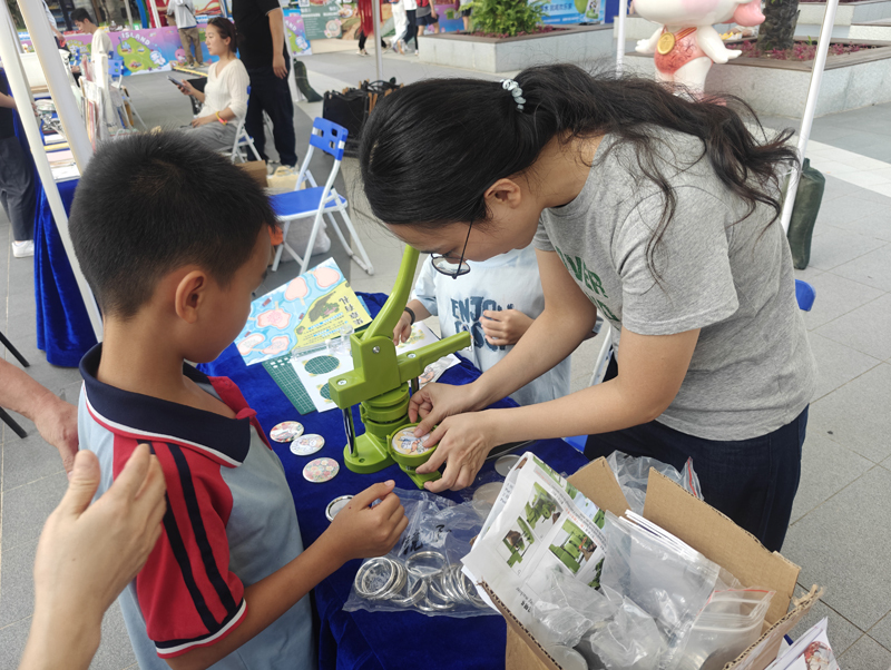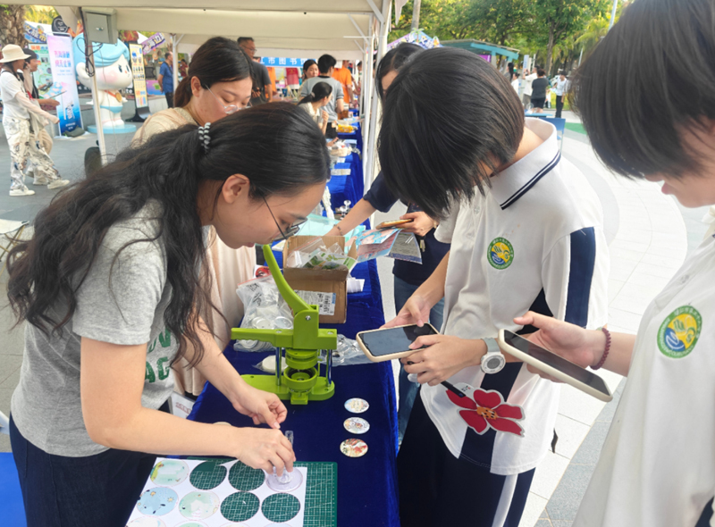 我馆推出的“吧唧“制作体验活动也备受年轻人欢迎。选好心仪的图案,往徽章制作机上一放,轻轻一推一按,个人专属文博徽章、实用冰箱贴或小巧随身镜就制作完成了。我馆这次带来了自主设计的多款专属图案——从馆藏文物到馆建标志,从非遗元素到湛江物产……每一款都藏着湛江的故事与温度。想要体验的观众络绎不绝,纷纷表示能亲手把这些带着历史感和地域特色的元素“封印”成小物件,无论是自己留作纪念,还是送给朋友,都很有意义。