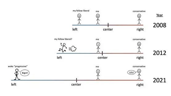 左派越走越远导致原先的中间派成为右派,图片来自马斯克自己的分析
