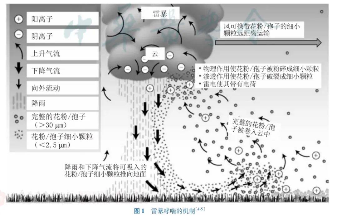 科研人员们提出了一个假说,认为这是因为在雷电风雨的作用下,平时那些比较大的难以进入人体下气道的花粉微粒(直径20-30μm)会被强风卷入高空的积雨云中,吸水膨胀,进而破裂,再被雷击碎成10μm以下的细小颗粒,然后随着雨水重回地面,随着呼吸进入了有哮喘或过敏性鼻炎这部分人群的下气道,从而引发哮喘的急性发作。